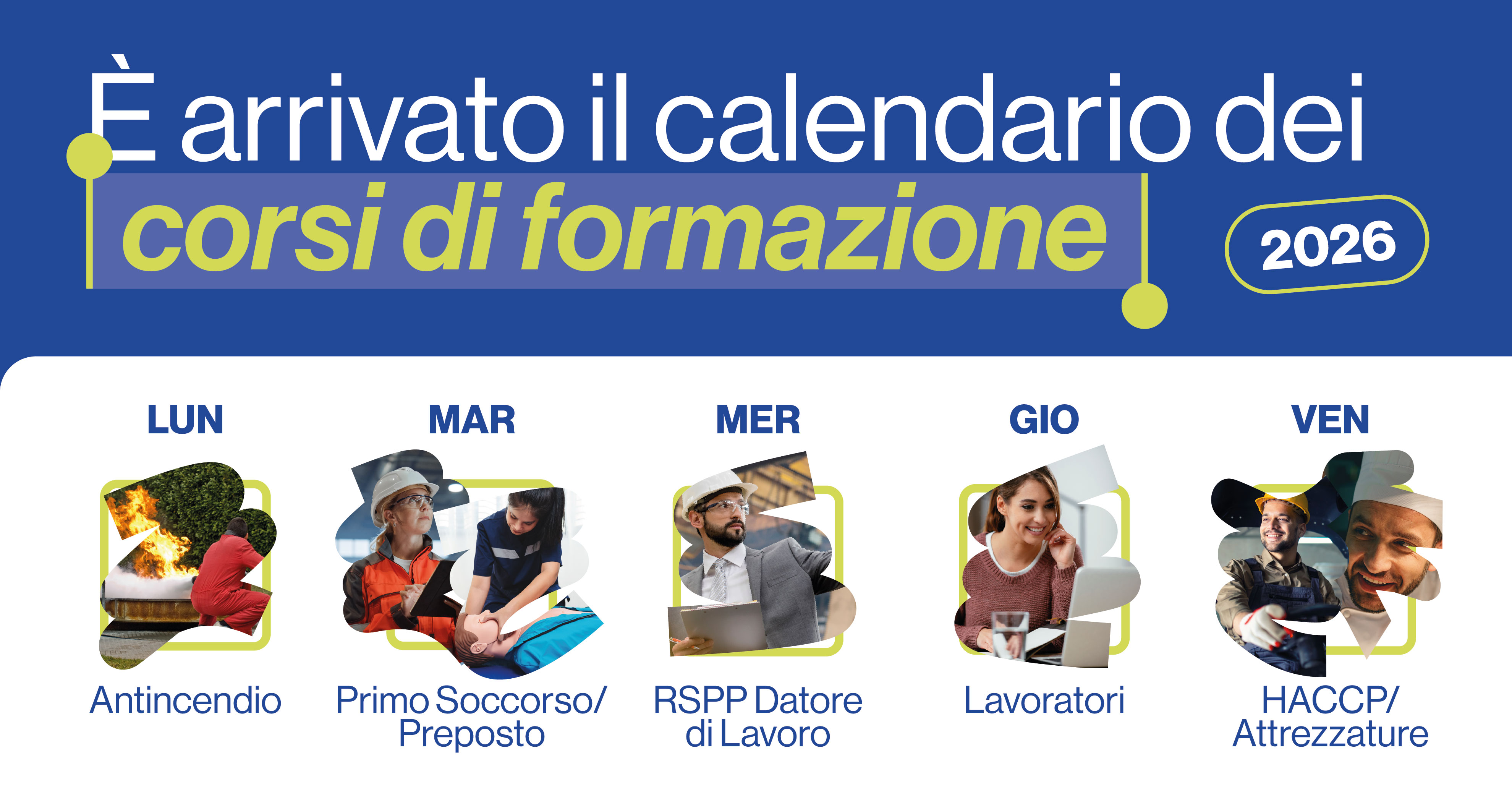 Torna il Calendario formativo 2026. Ogni giorno, tutti i giorni puoi trovare il corso adatto alla tua azienda, per essere sempre aggiornato sulle normative di sicurezza secondo il Decreto Legislativo 81/2008 in materia di sicurezza sui luoghi di lavoro.
